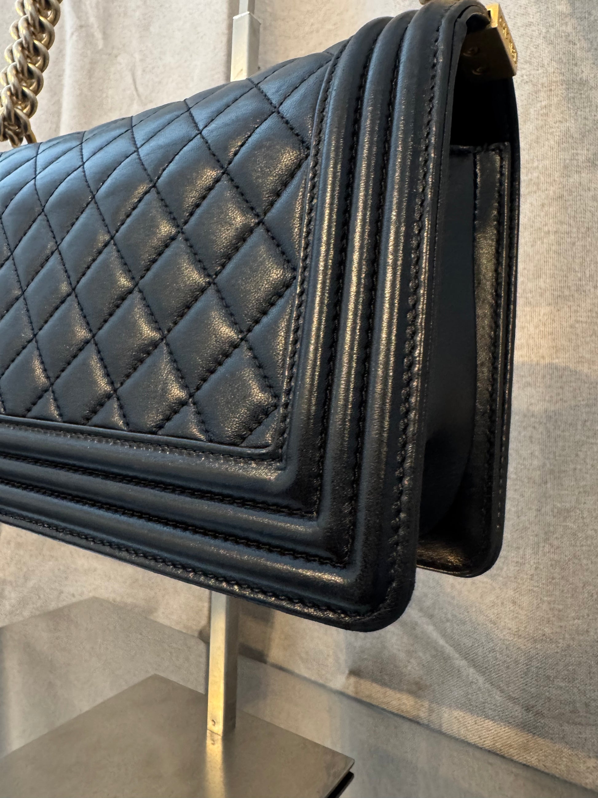 Ikonisk Chanel Boy Bag i sort quiltet læder med guld hardware. Tasken har den karakteristiske firkantede form, kraftig kæderem med læderstykke for komfort samt den ikoniske Boy CC-lås foran. En tidløst taske, der kombinerer klassisk elegance med et moderne twist.