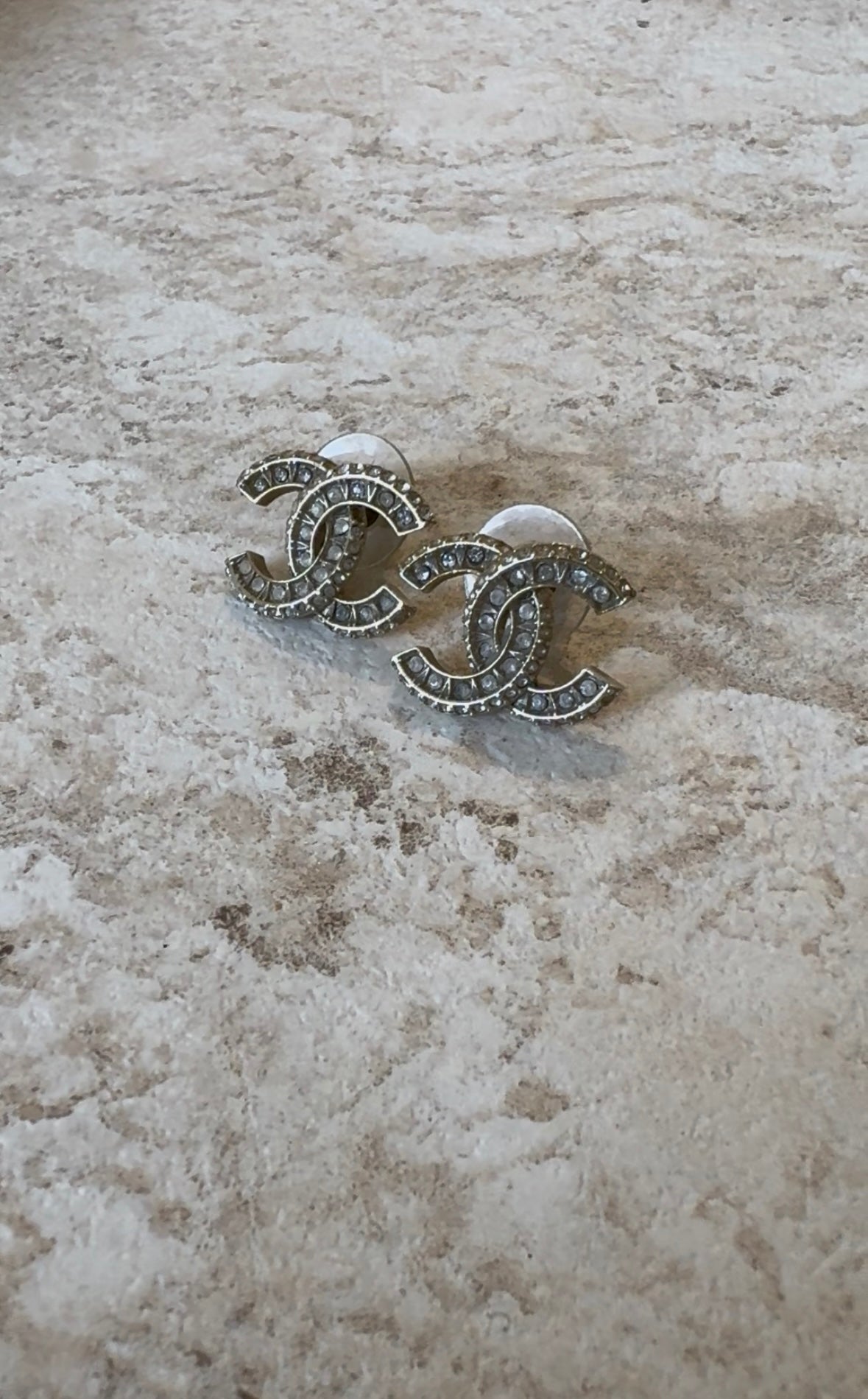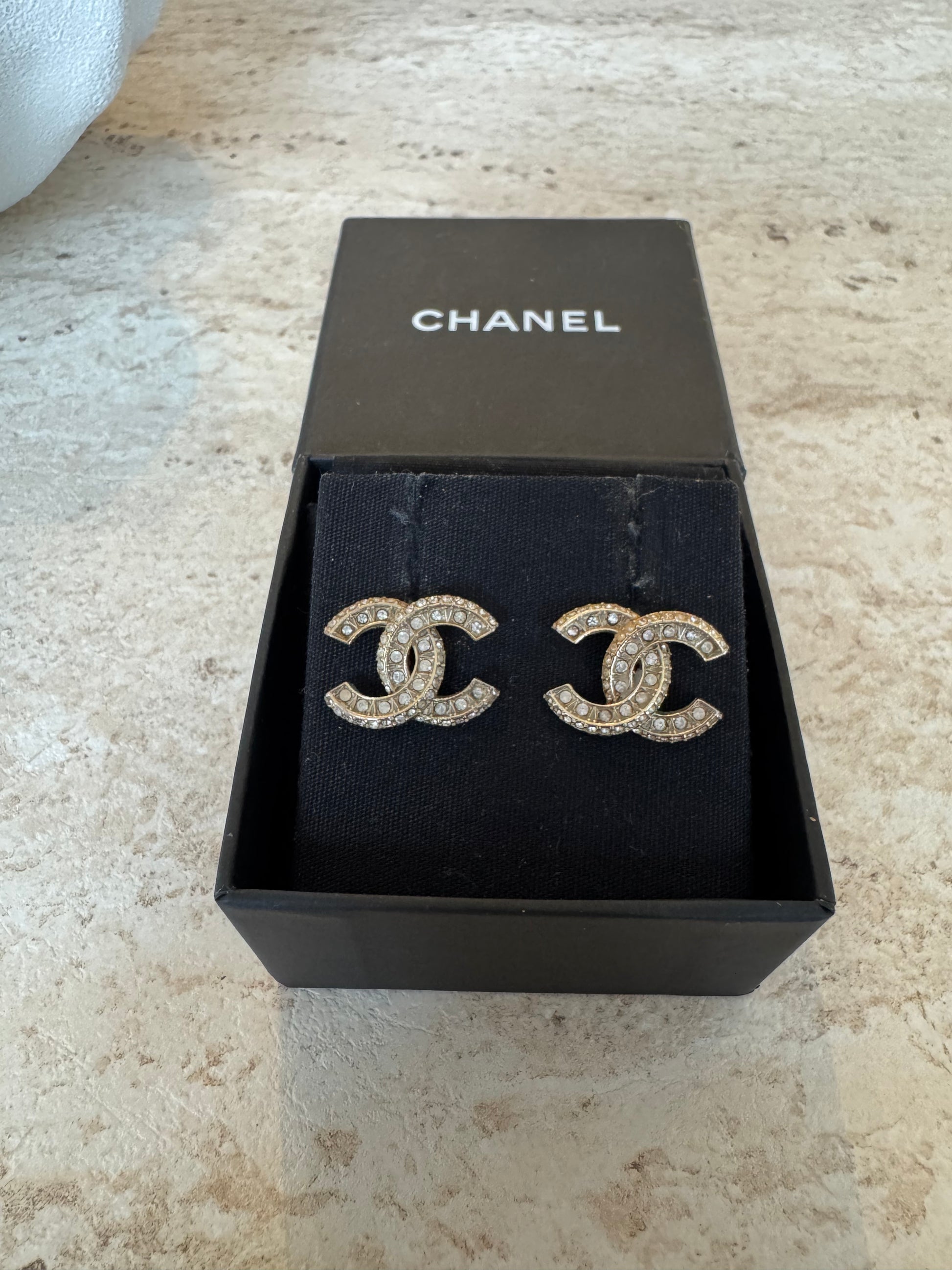 Smukke og ikoniske Chanel øreringe. Svagt guldbelagt med klare sten. Øreringene har det velkendte dobbelte CC-logo og leveres i original sort Chanel-æske.