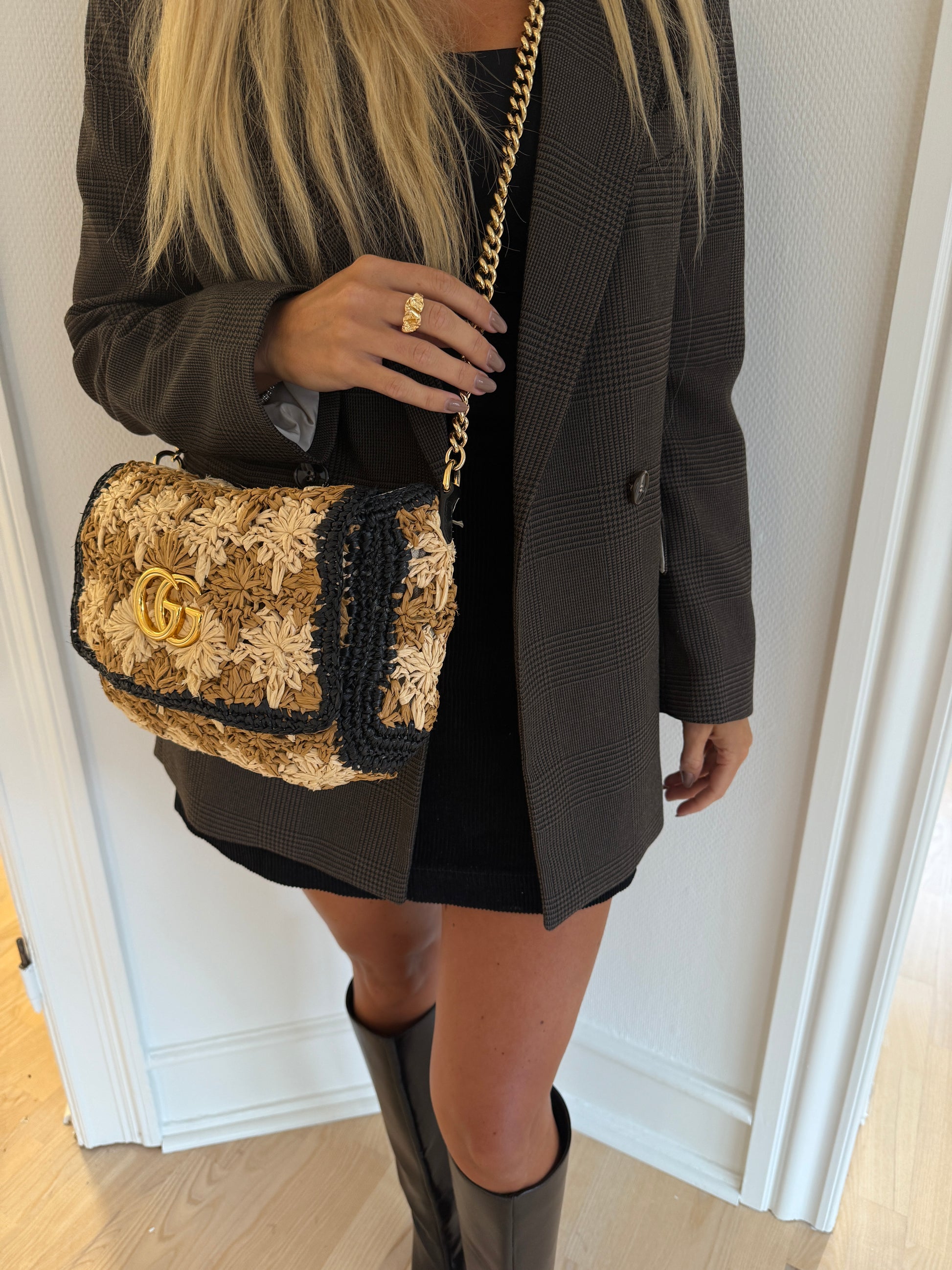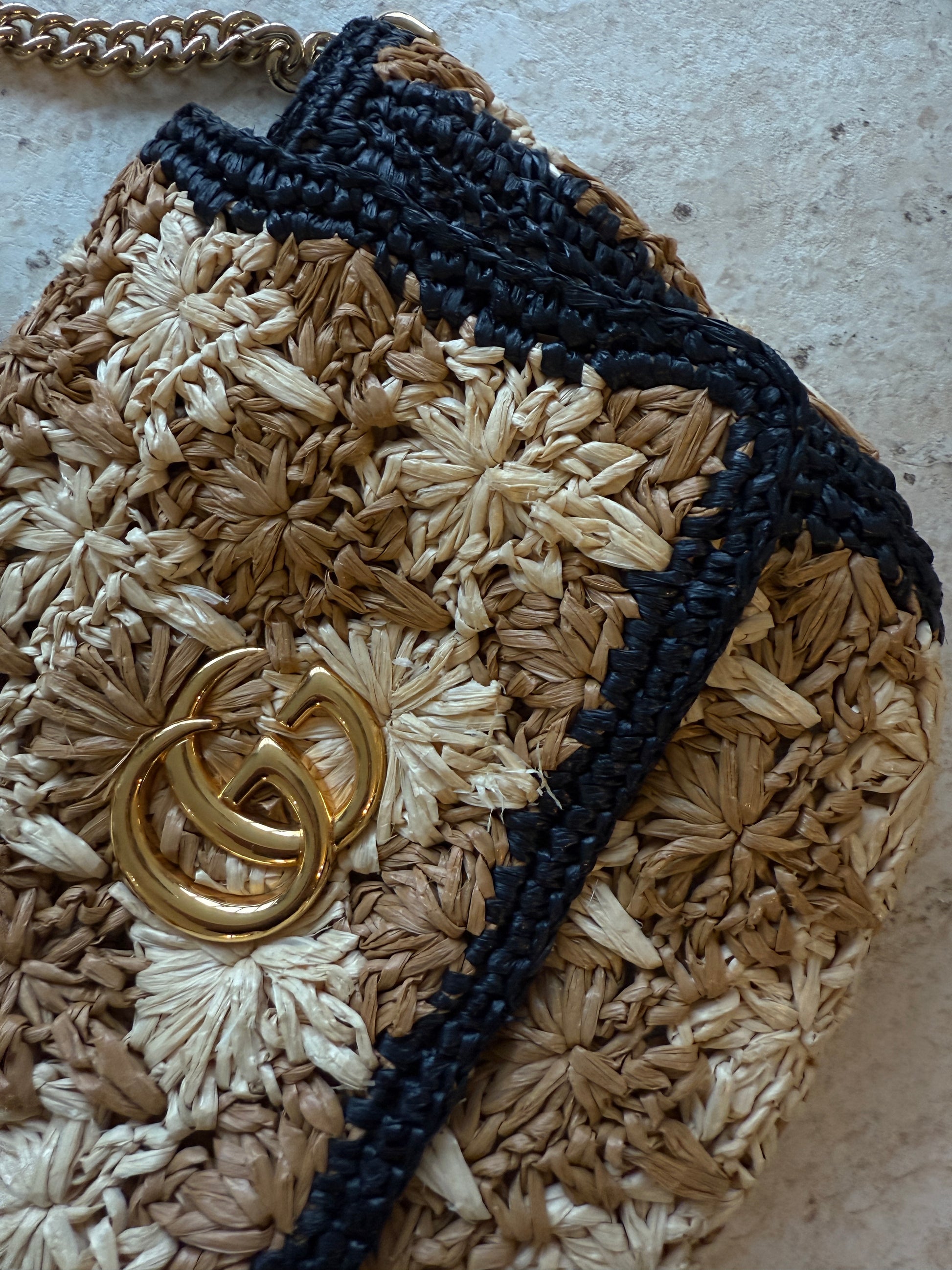 Gucci skuldertaske i flet med klassisk GG monogram i guld.