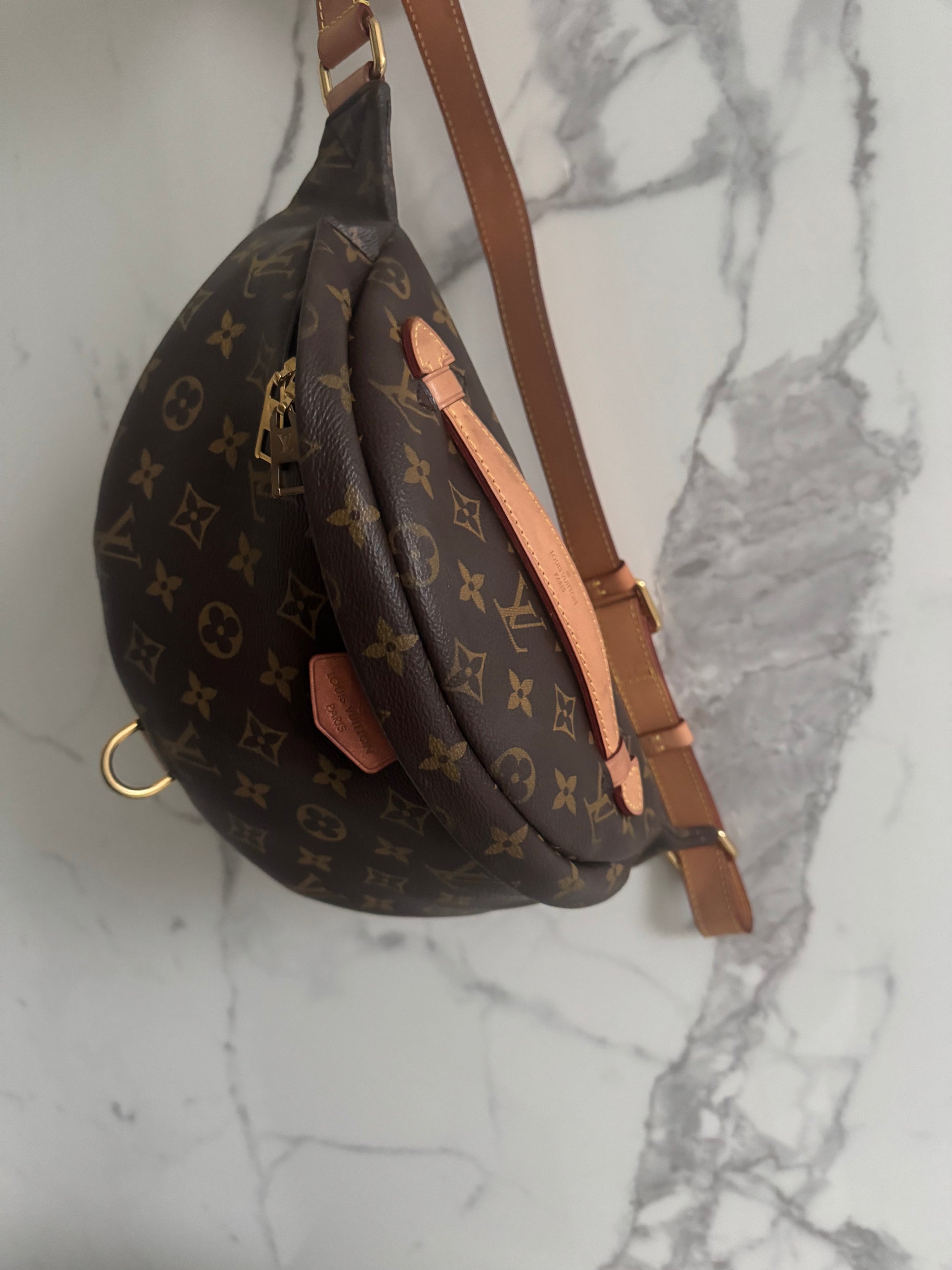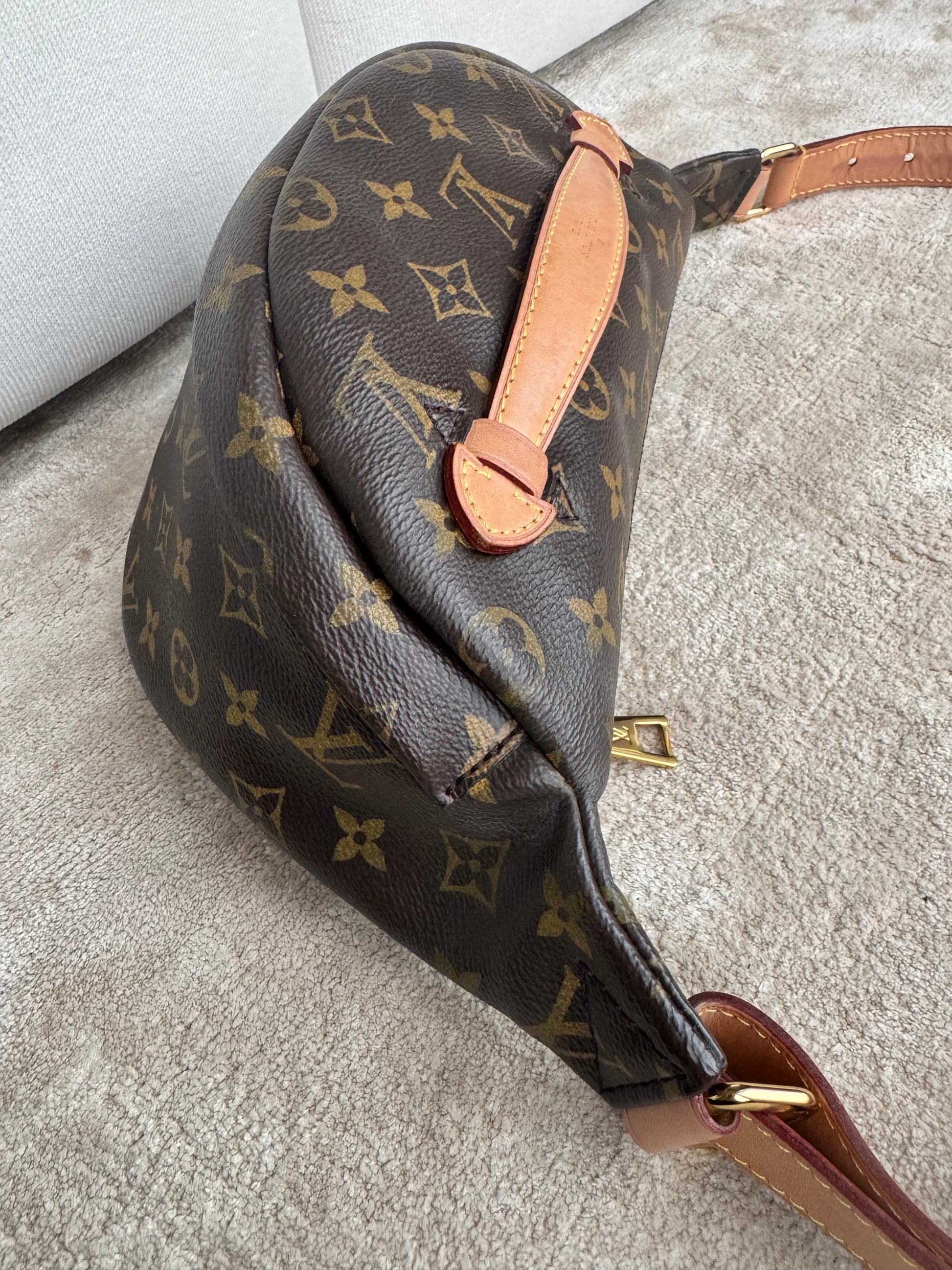Ikonisk Louis Vuitton Bumbag i klassisk Monogram canvas med smukke vachetta-læderdetaljer og guld hardware. En yderst populær og eftertragtet model, der kombinerer funktionalitet med tidløst design.