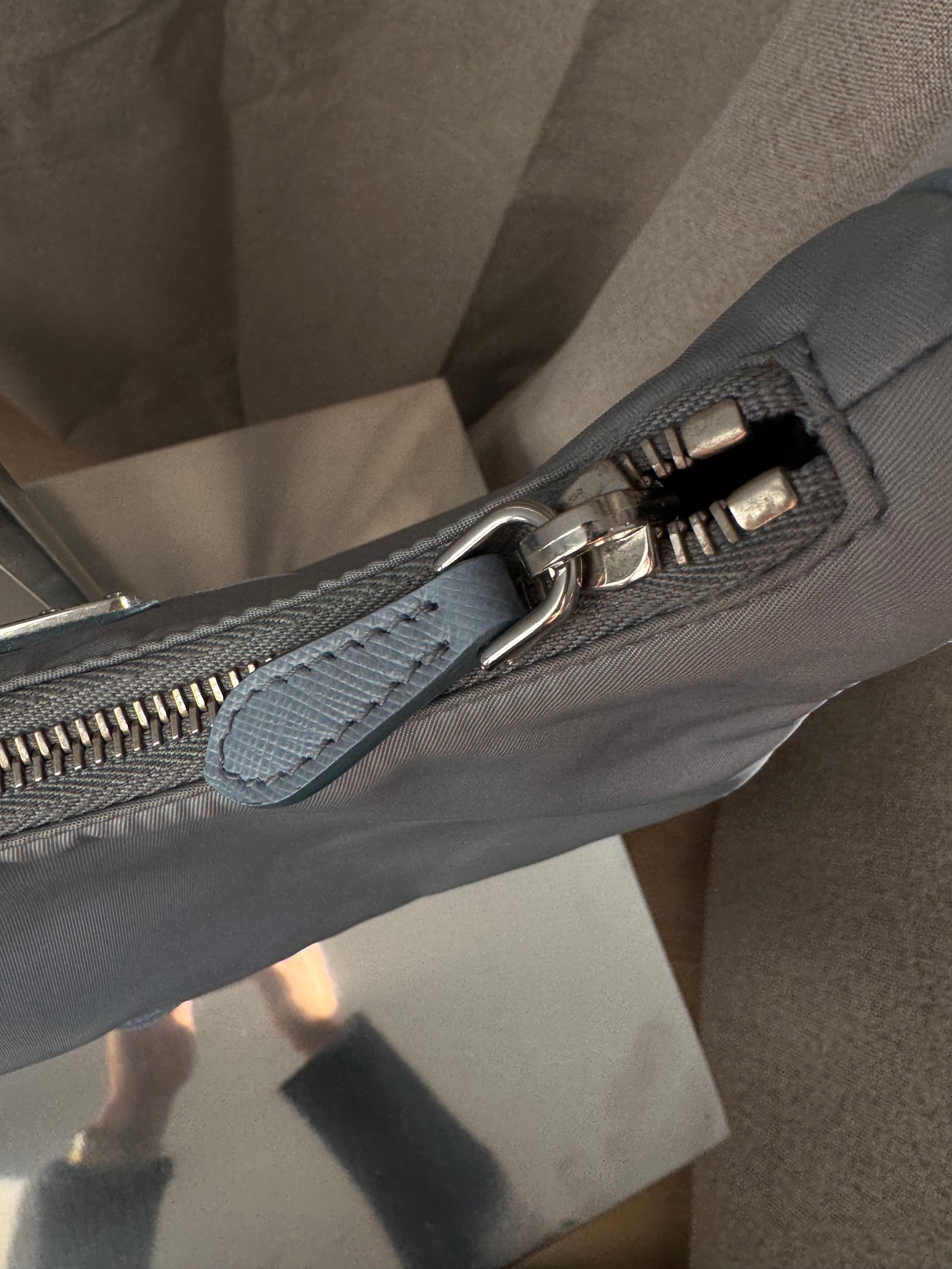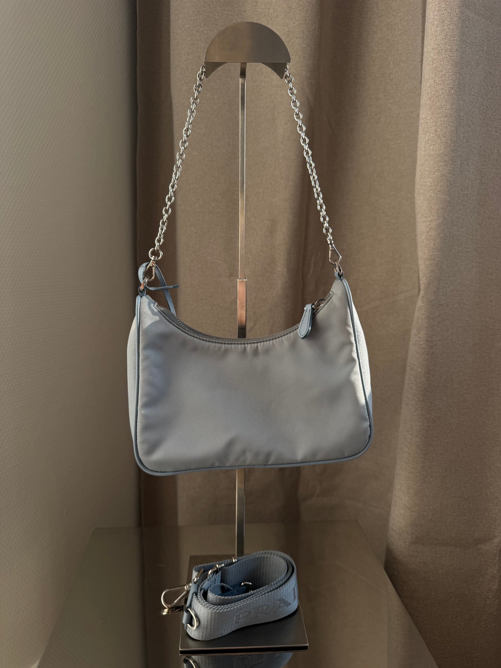 Ikonisk Prada Re-Edition 2005 skuldertaske i lyseblå nylon med sølvfarvede detaljer. Modellen er kendt for sit tidløse design og alsidighed og er en af Pradas mest eftertragtede styles.