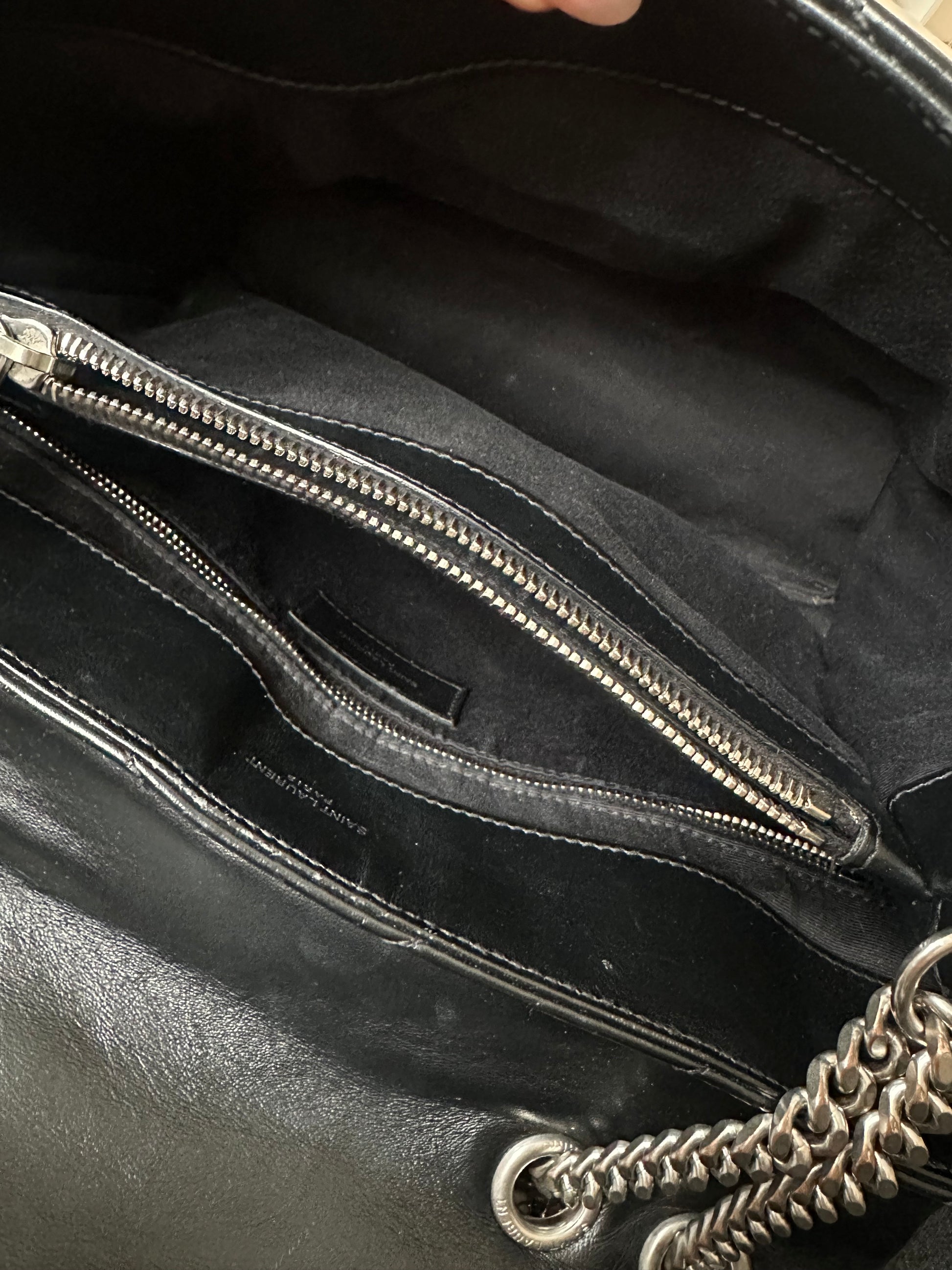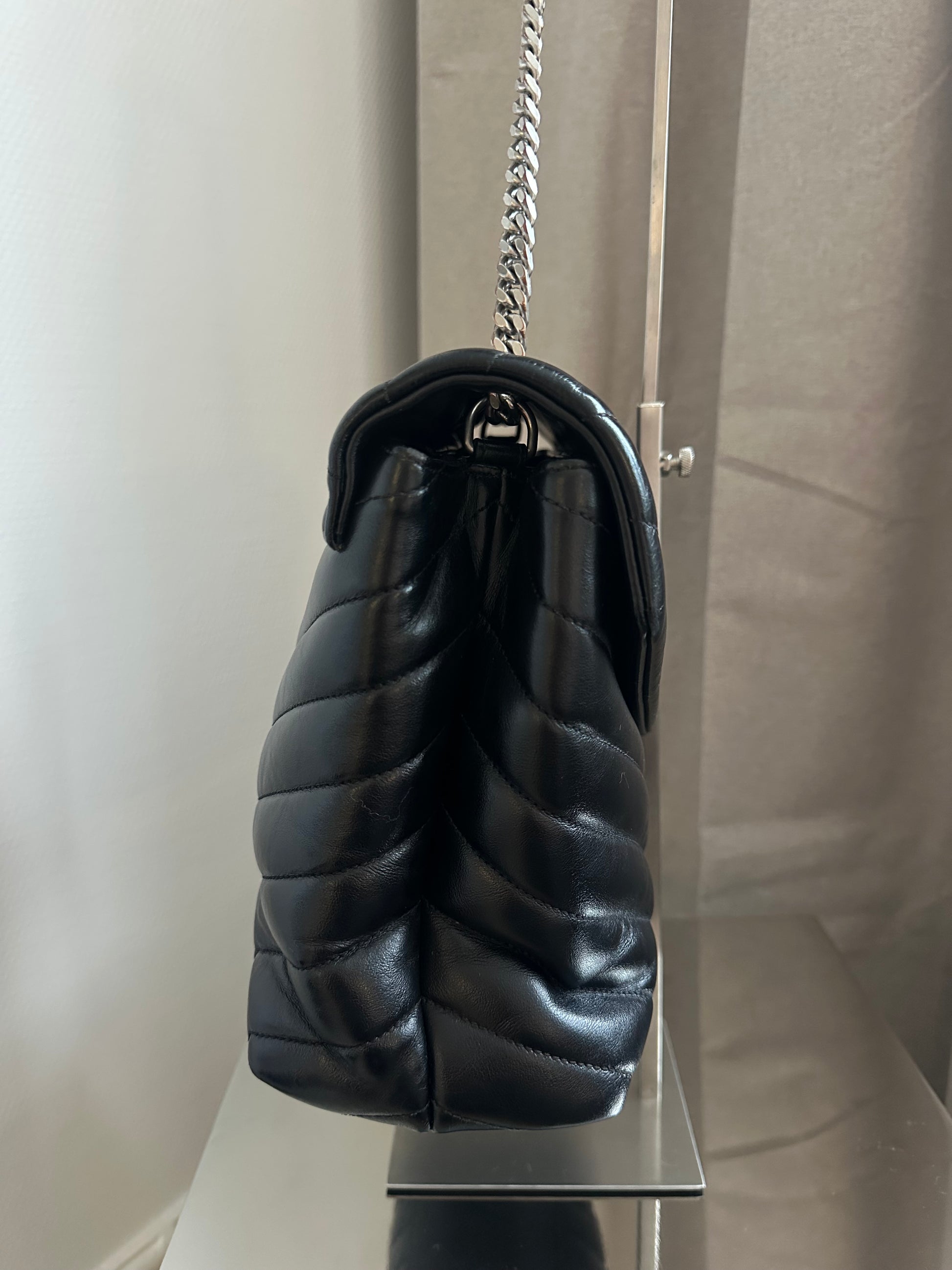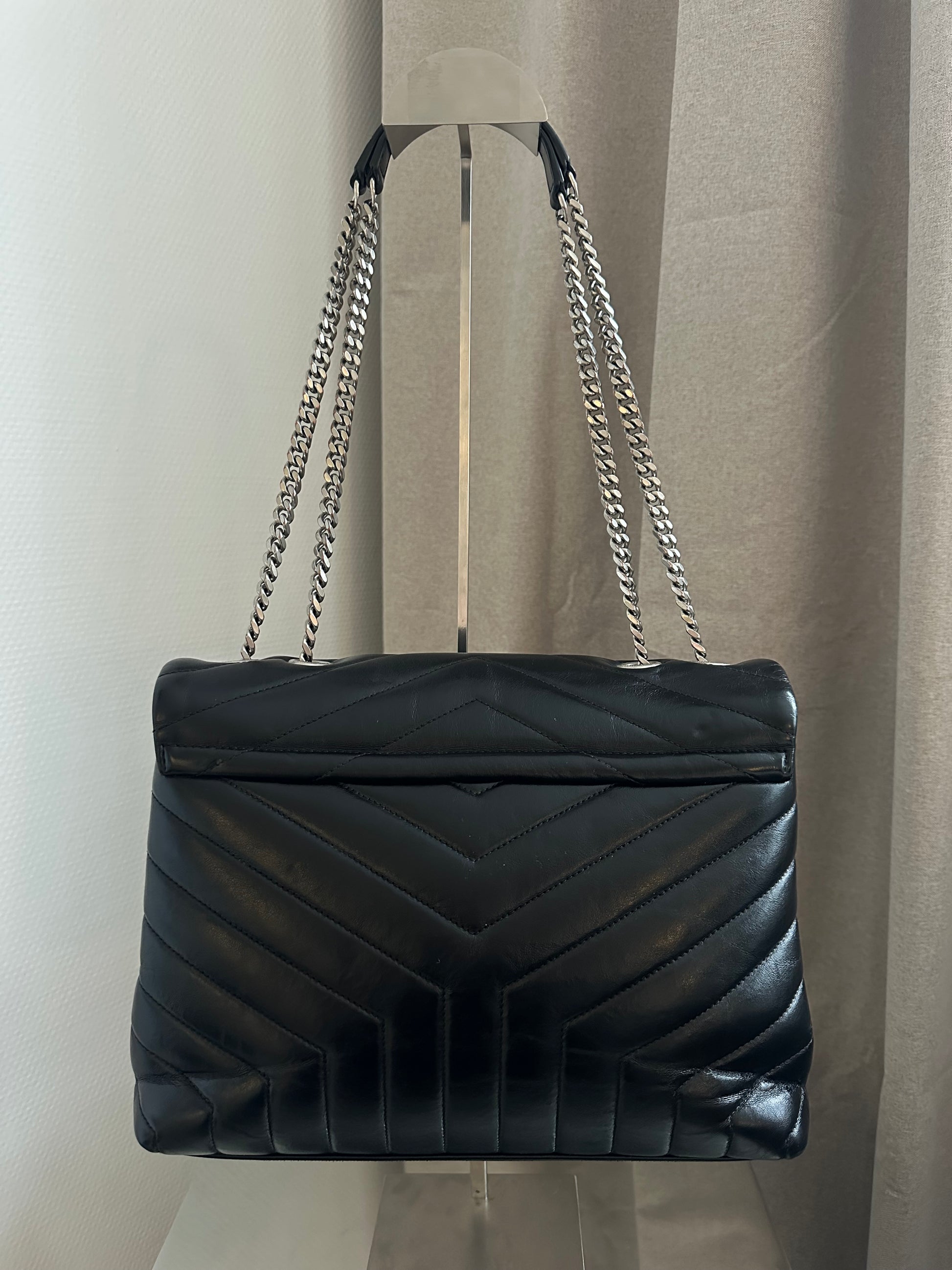 Elegant og tidløs Saint Laurent Loulou Medium skuldertaske i sort quiltet læder med sølvfarvet kæderem og ikonisk YSL-logo på fronten. Tasken har en luksuriøs og blød struktur, der gør den perfekt både til hverdagsbrug og aftenanledninger.