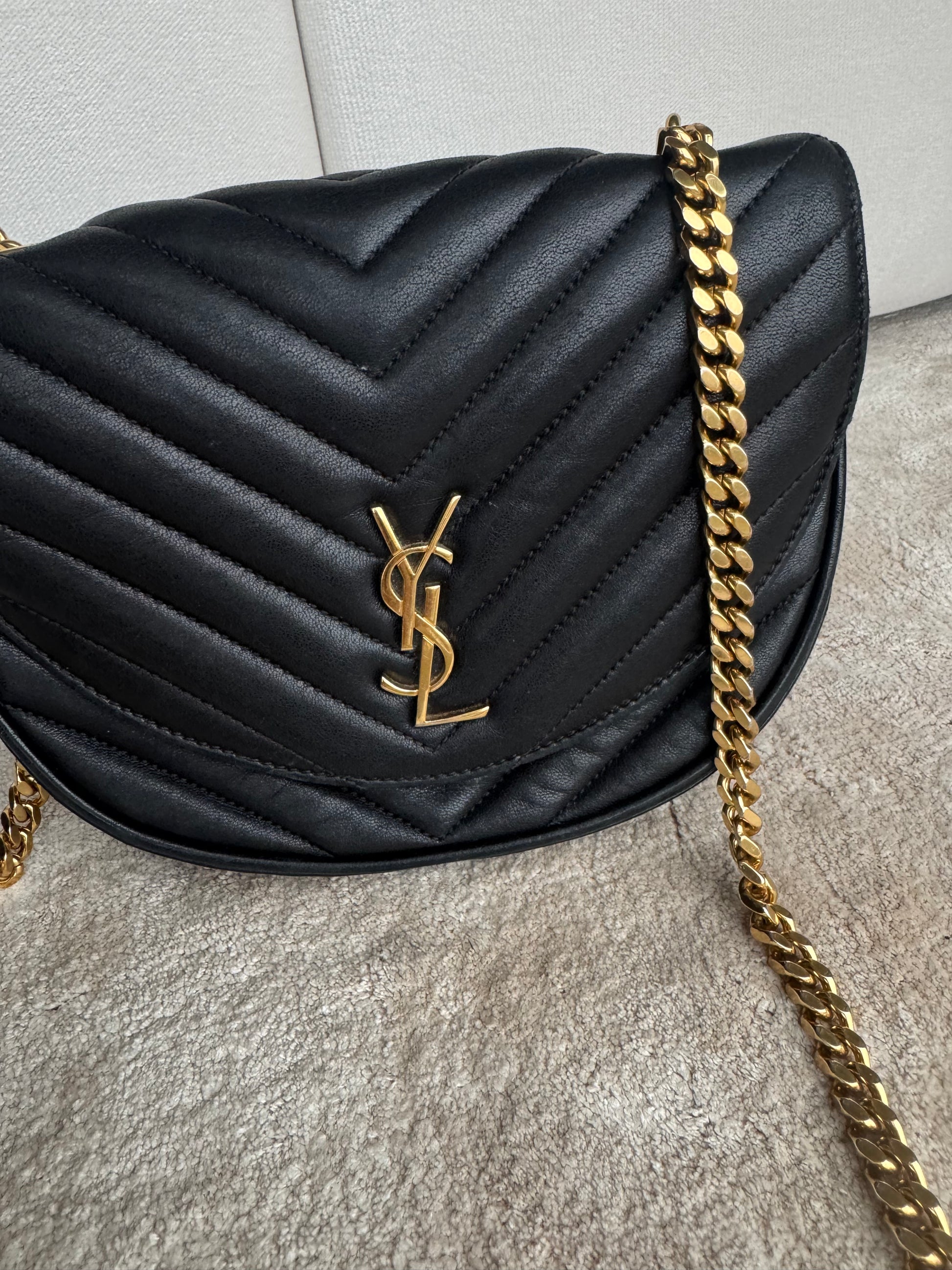 Tasken fremstår i super flot stand med velholdt læder, pæne quiltninger og flot hardware. Den ikoniske YSL-logo lukning i guld fuldender det klassiske design.
